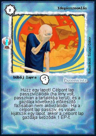 Kiadás: Ébredés, Védnök 2025 Gyakoriság: gyakori Lapszín (isten): Pszionicista Klán Típus: bűbáj lapra Szöveg: Húzz egy lapot! Célpont lap passzivizálódik (ha lény volt, passzívan a tartalékba kerül), és a gazdája következő előkészítő fázisában nem aktivizálódik. Ha a célpont lap passzív, és valaki kijátszik egy lapot, akkor a célpont lap gazdája sebződik 1 ÉP-t. Illusztráció: