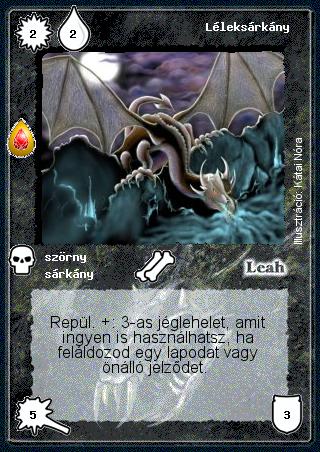 Kiadás: Zu'lit kincse Gyakoriság: ritka Lapszín (isten): Leah Típus: szörny Altípus: sárkány Szöveg: Repül. +: 3-as jéglehelet, amit ingyen is használhatsz, ha feláldozod egy lapodat vagy önálló jelződet. Illusztráció: Kátai Nóra