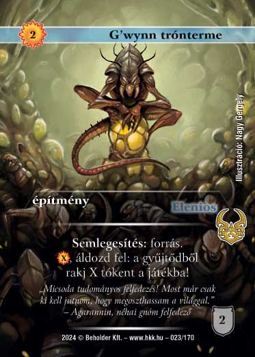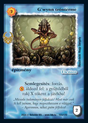 Kiadás: Ősi Káosz Gyakoriság: ritka Lapszín (isten): Elenios Típus: építmény Altípus: - Szöveg: Semlegesítés: forrás. (X), áldozd fel: a gyűjtődből rakj X tókent a játékba! Szinesítő szöveg: "Micsoda tudományos felfedezés! Most már csak ki kell jutnom, hogy megoszthassam a világgal." - Agarannin, néhai gnóm felfedező Illusztráció: Nagy Gergely
