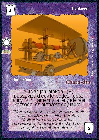 Kiadás: A tizenhármak városa (Zén) Gyakoriság: ritka Lapszín (isten): Chara-din Típus: építmény Szöveg: Aktívan jön játékba. (P), passzivizáld egy lényedet: kapsz annyi VP-t, amennyi a lény idézési költsége, és húzhatsz egy lapot. Szinesítő szöveg: "Már megint én jövök? Hiszen csak most szálltam ki! - Hja, barátom, Malkorban csak akkor lesz maradásod, ha reggeltől estig húzod az igát a Tizenhármaknak." Illusztráció: